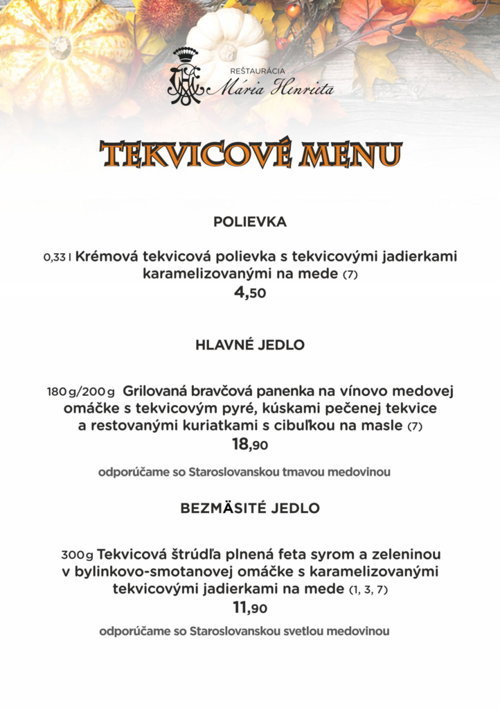 Milí hostia, pozývame vás na TEKVICOVÉ MENU, ktoré si môžete vychutnať v priestoroch Reštaurácie Mária Henrieta od 31. októbra 2025.